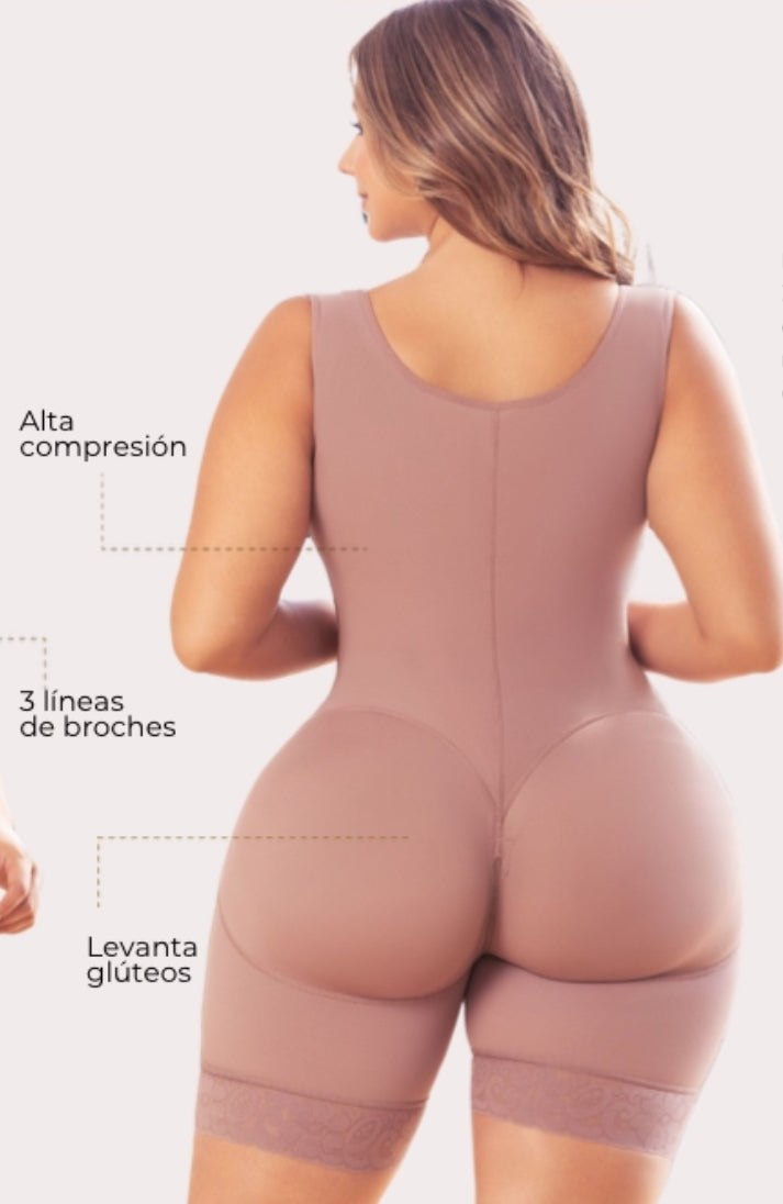 Faja elaborada en tela powernet, alta compresión, 3 líneas de broches al frente, cierre perineal, espalda cubierta, broches en los hombros para mayor ajuste, levanta glúteos, blondas en piernas con bandas de silicona, para que no se enrolle
