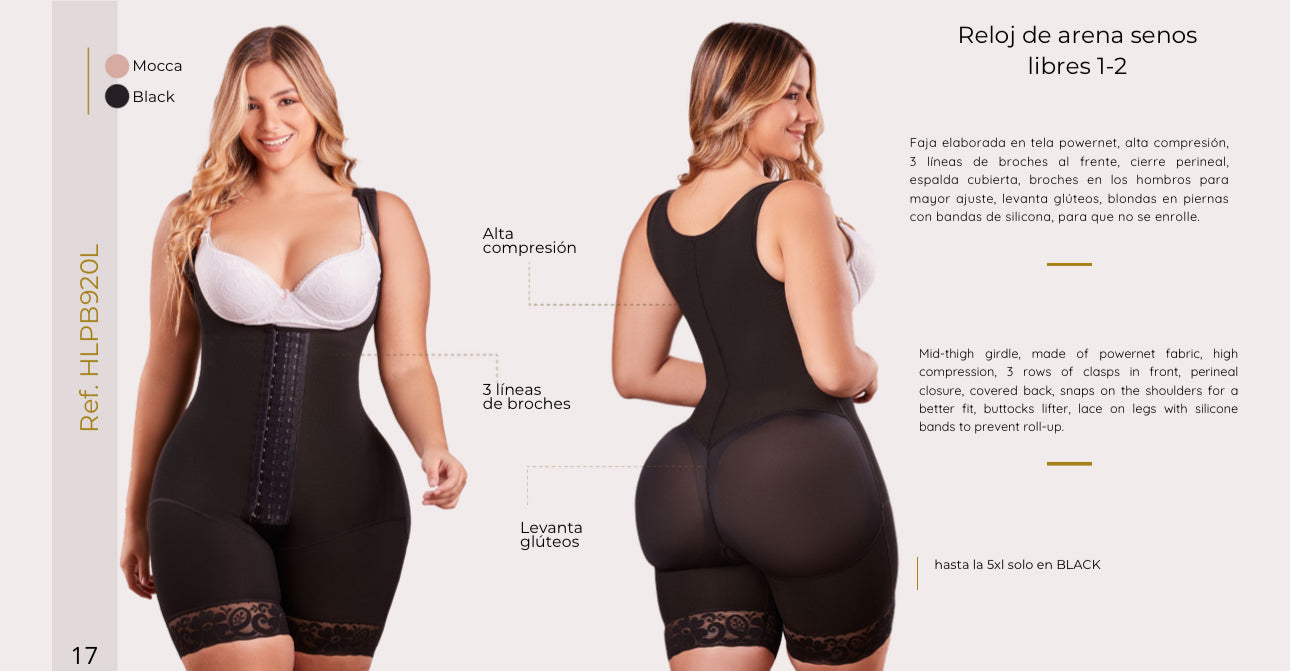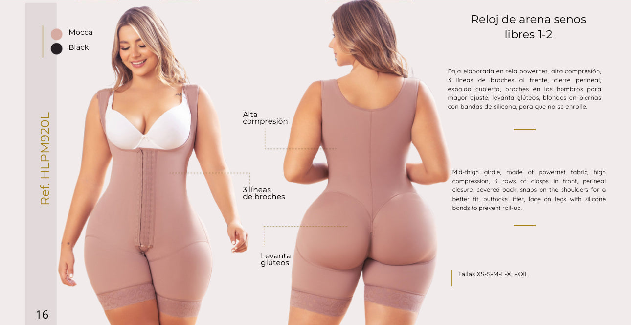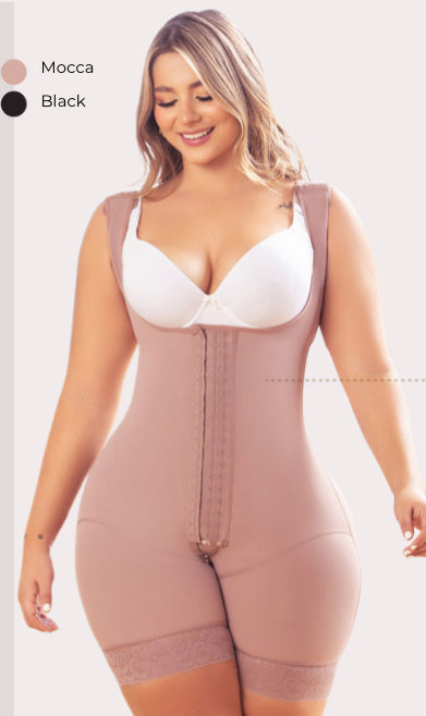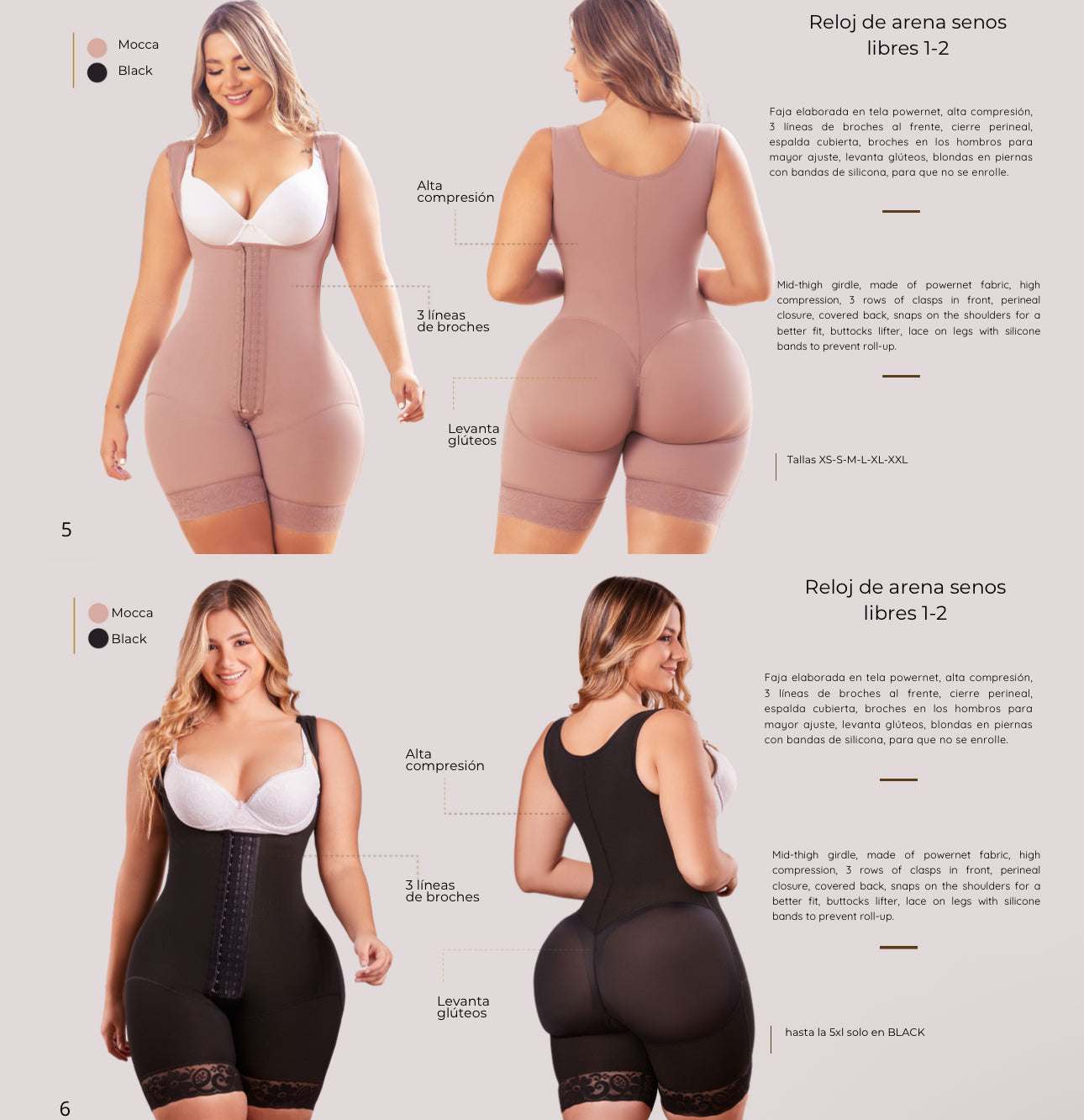 Mid-thigh girdle, made of powernet fabric, high compression, 3 rows of clasps in front, perineal closure, covered back, snaps on the shoulders for a better fit, buttocks lifter, lace on legs with silicone bands to prevent roll-up.