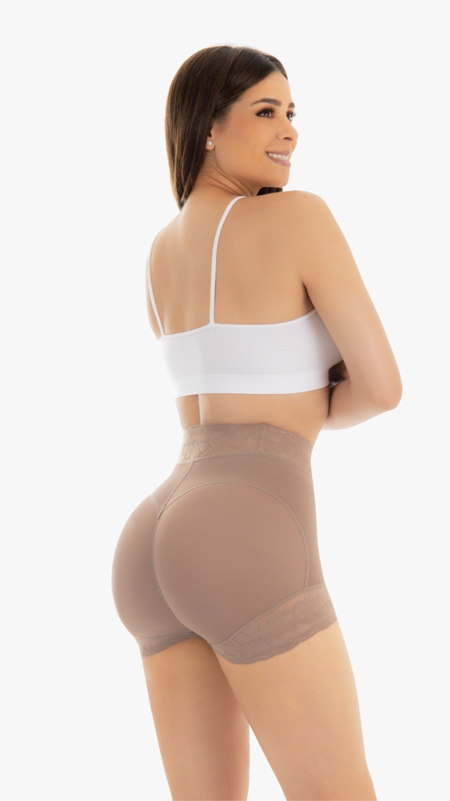 super panty made of high compression powernet fabric, with abdomen control, buttock lift, lace on legs and waist, silicone bands to prevent it from rolling up.